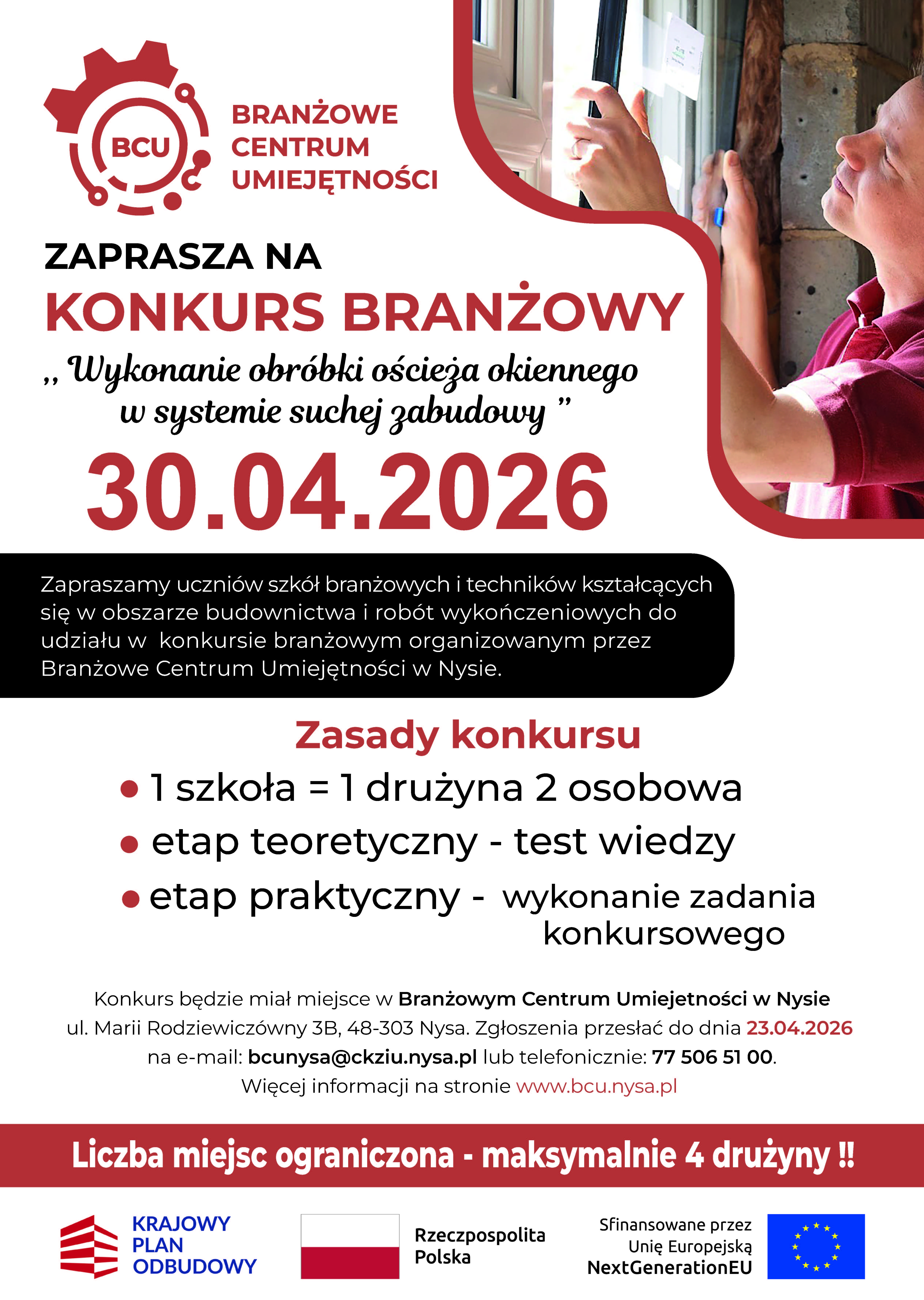 7 marca 2026 r. w Branżowym Centrum Umiejętności w Nysie odbyły się Zawody Okręgowe XXXIX Olimpiady Wiedzy i Umiejętności Budowlanych – wyjątkowe wydarzenie skierowane do młodzieży zainteresowanej budownictwem i rozwijaniem kompetencji zawodowych w tej dziedzinie.
